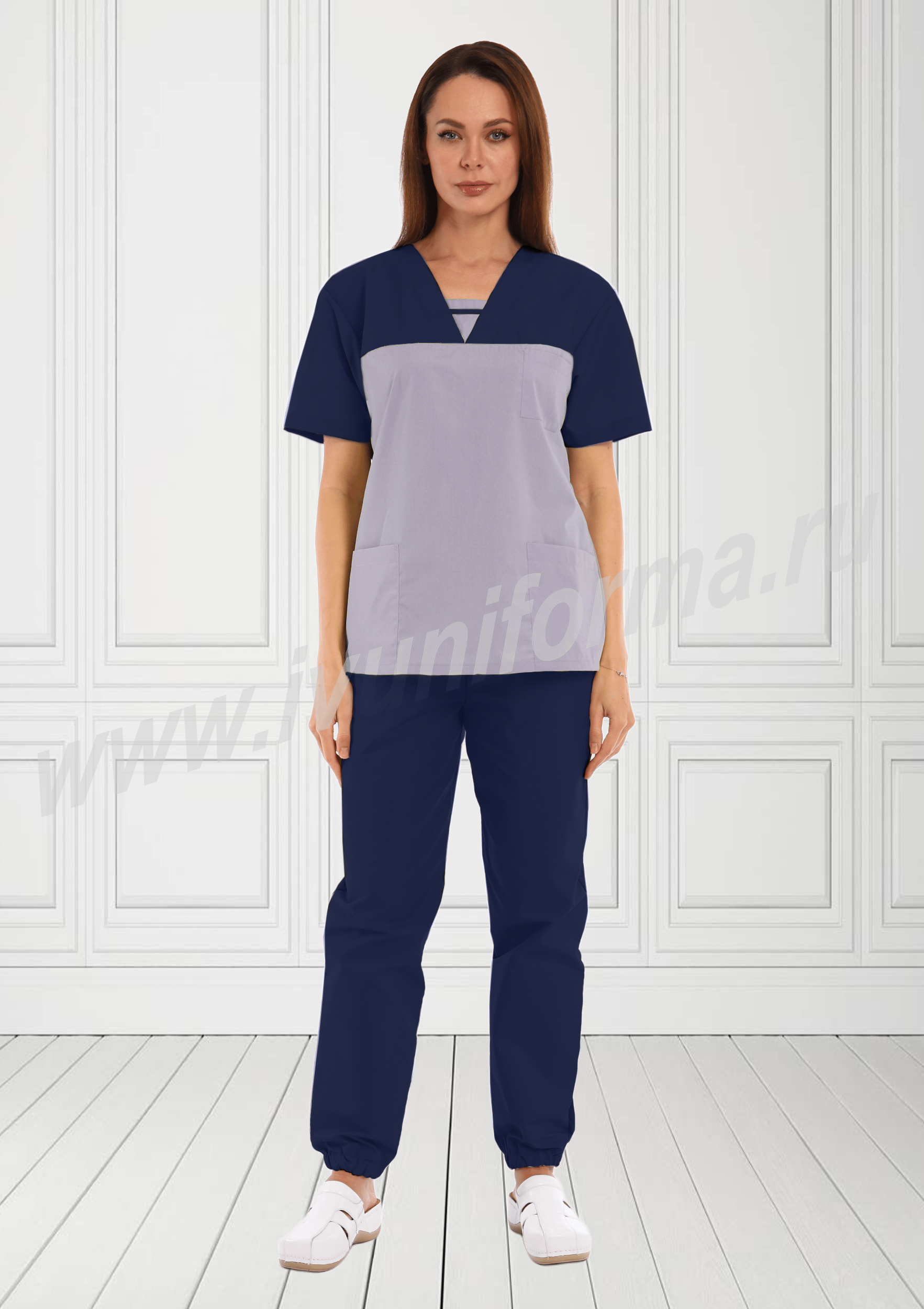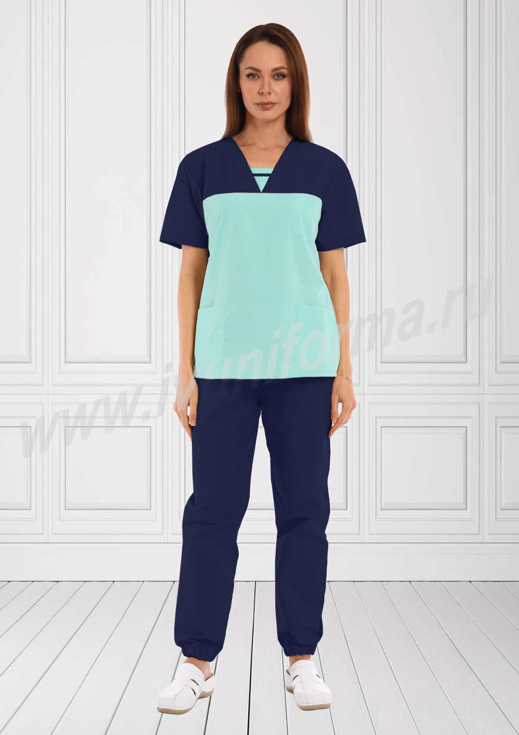 Костюм женский универсальный состоит из куртки и брюк. Куртка прямого силуэта средней длины, в нижней части полочки расположены боковые вместительные карманы, в верхней части имеется удобный нагрудный карман. Полочка с отрезными  кокетками, с V-образным вырезом горловины, декорирована эффектной вставкой. Спинка прямая, рукава короткие, втачные.  Брюки – джоггеры  на резинке создают динамичный образ современного специалиста. Костюм выполнен из легкой смесовой ткани, прост в уходе, предназначен для медицинских работников и персонала СПА салонов.