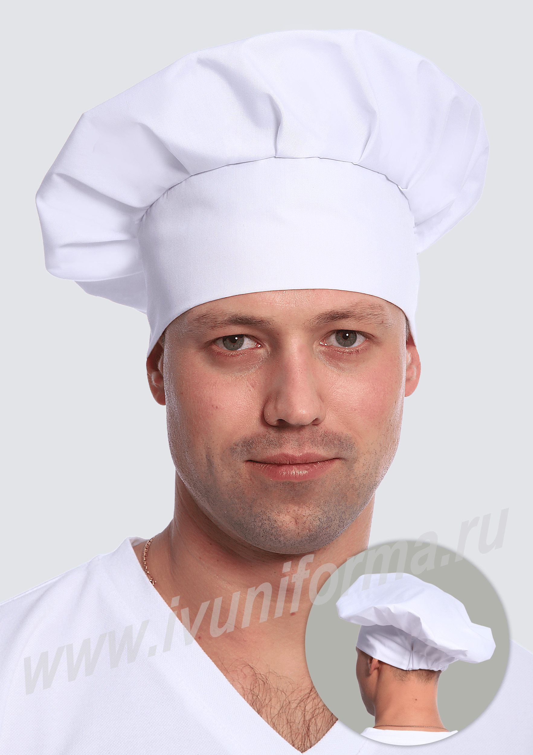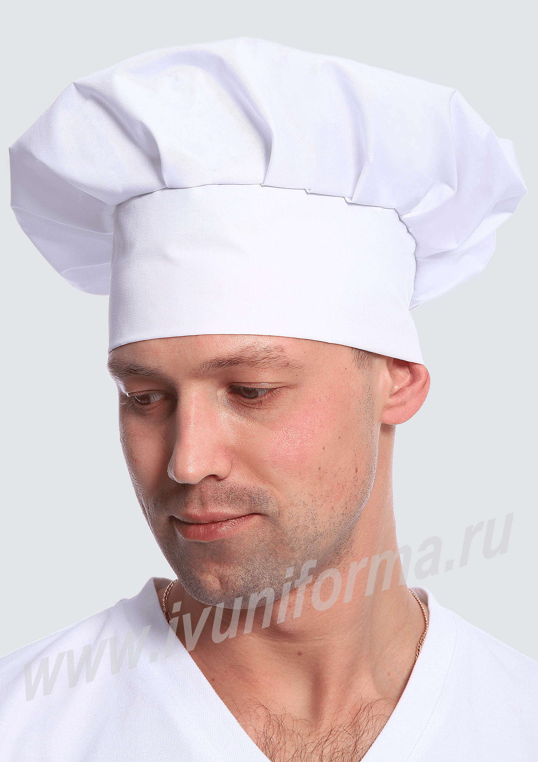 Колпак повара, имеющий форму гриба, белый мужской с объемной тульей, заложенной в равномерные складки. Размер колпака регулируется за счет вставки с эластичной тесьмой, что делает его удобным и практичным. Колпак повара предназначен для сотрудников пищевой отрасли.