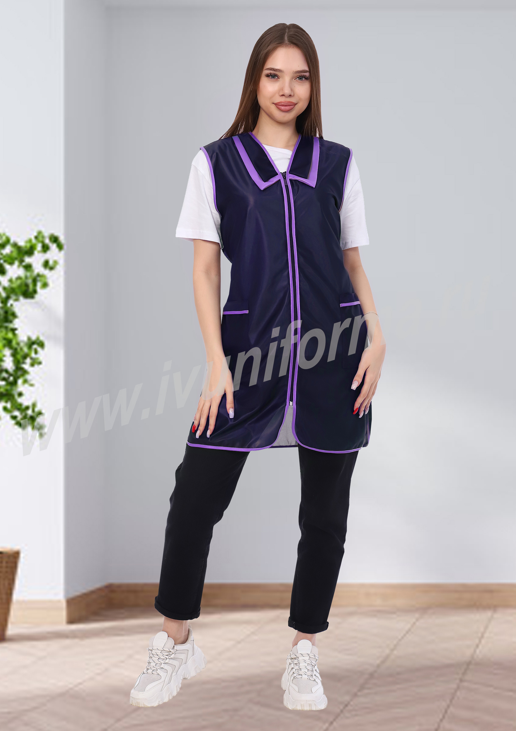 Сарафан женский укороченный прямого силуэта с центральной застежкой на молнию. Полочка с двумя нижними накладными карманами и разрезами по боковым швам. Нижний слой отложного полуворотника выполнен из контрастной ткани. Спинка без отделки, объем талии регулируется полупоясами. Все детали сарафана обработаны износостойким кантом. Сарафан предназначен для защиты от общепроизводственных загрязнений.